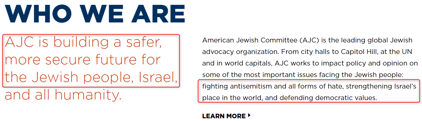 Однако эта организация вообще никак не связана с бизнесом или инвестициями. Заявленные на ее сайте цели - "борьба с антисемитизмом и всеми формами ненависти, укрепление места Израиля в мире и защита демократических ценностей".