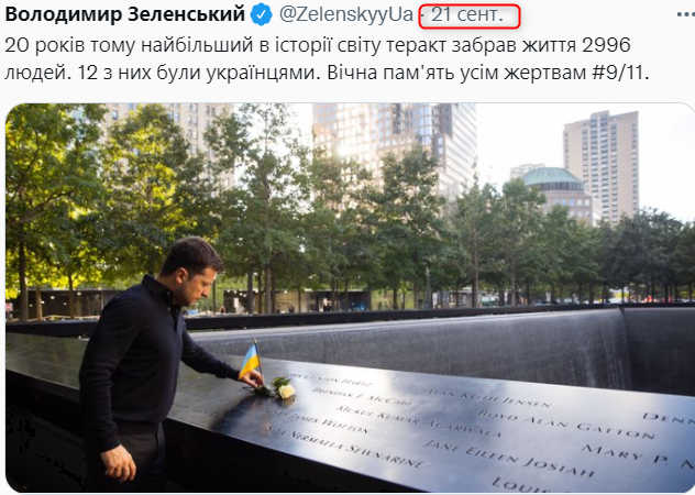Утром 21 сентября Зеленский возложил цветы к мемориалу жертвам терактов 11 сентября 2001 года в Нью-Йорке. При этом пользователи удивились формулировке - "20 лет назад крупнейший в истории мира теракт унес жизни 2996 человек".