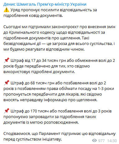 На заседании в среду, 22 сентября, Кабмин утвердил законопроект об ужесточении ответственности за подделку сертификатов о вакцинации. Штрафы для украинцев за использование поддельных ковид-паспортов будут достигать 34 тысяч гривен, в качестве наказания также предлагается ввести ограничение свободы.