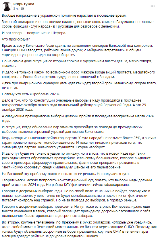 Говорят о досрочных выборах Рады. Но по своей воле Зе на них не пойдет, потому что в новом парламенте у него точно не будет монобольшинства и после них он фактически потеряет контроль над страной. Но не за полгода до выборов, а гораздо раньше.