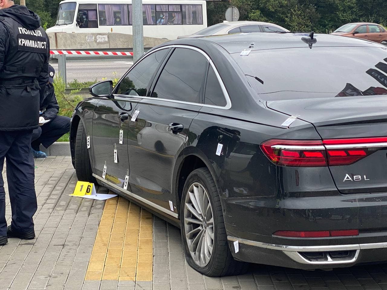 После него выступил глава Нацполиции Игорь Клименко. Он заявил, что стреляли скорее всего из автомата, судя по количеству пуль (более 10 входных отверстий). Одна из них попала в заднее колесо, и на нем автомобиль проехал еще пять километров.