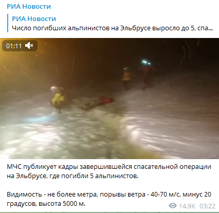 Напомним, что на высоте 5 400 метров на Эльбрусе группа альпинистов из 23 человек из-за ухудшения погодных условий попросила о помощи. Позже МЧС уточнило, что группа состояла из 19 человек. Сообщалось, что сначала удалось обнаружить восемь человек, из которых трое были уже без признаков жизни, затем живыми нашли еще девять альпинистов.