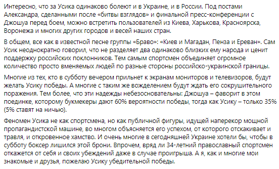 Интересно, что за Усика одинаково болеют и в Украине, и в России. Под постами Александра, сделанными после «битвы взглядов» и финальной пресс-конференции с Джошуа перед боем, можно встретить пользователей из Киева, Харькова, Красноярска, Воронежа и многих других городов и весей наших стран.