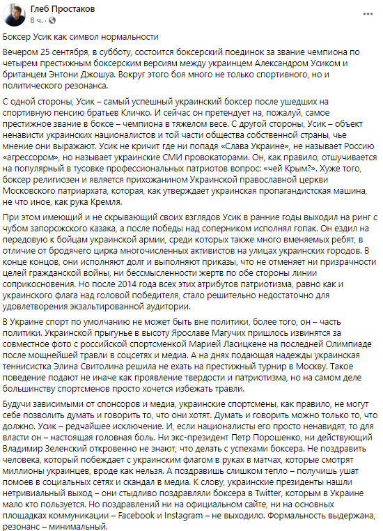 Журналист Глеб Простаков поэтому считает Усика "символом нормальности". И рассуждает об идеологическом значении этого спортсмена.
