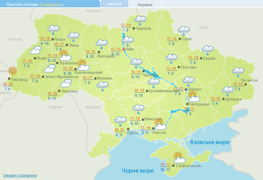 Завтра в большинстве областей, кроме юго-западной части, пройдут небольшие дожди. Ветер преимущественно северо-западный  7-12 м/с. На левобережье страны отдельные порывы 15-20 м/с.