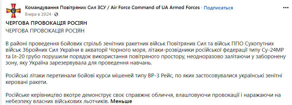 "В районе проведения боевых стрельб зенитных ракетных войск Воздушных сил и войск ПВО Сухопутных войск Вооруженных сил Украины в акватории Черного моря самолеты-разведчики российской федерации типа Су-24МР и Ил-20 грубо нарушили порядок использования воздушного пространства, неоднократно залетая в запретную зону, которую Украина зарезервировала для проведения учений. Российские самолеты пересекали боевые курсы мишеней типа ВР-3 Рейс, по которым применялись украинские зенитные управляемые ракеты", - заявили в пресс-службе командования.