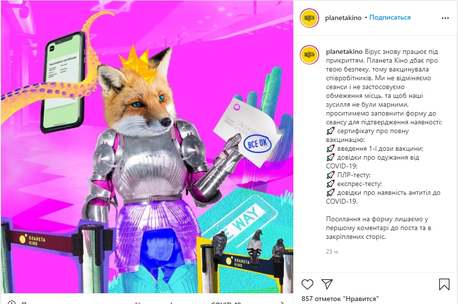 Сеть кинотеатров "Планета Кино", которая является одной из крупнейших в Украине, просит посетителей перед визитом заполнить специальную форму, где указать, есть ли у клиента паспорт вакцинации, справка о том, что человек переболел ковидом, негативный ПЦР-тест или экспресс-тест на коронавирус.