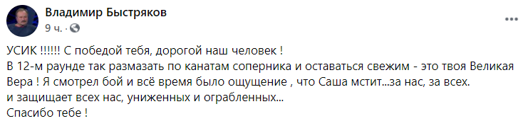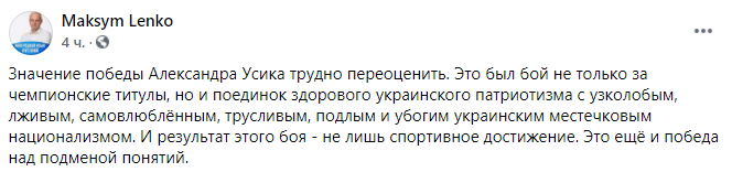 "Значение победы Александра Усика трудно переоценить. Это был бой не только за чемпионские титулы, но и поединок здорового украинского патриотизма с узколобым, лживым, самовлюблённым, трусливым, подлым и убогим украинским местечковым национализмом. И результат этого боя - не лишь спортивное достижение. Это ещё и победа над подменой понятий".