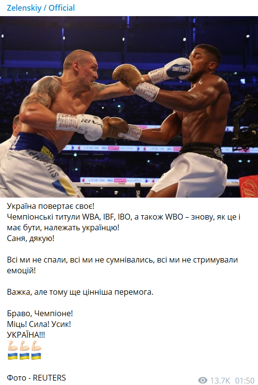Правда, в контексте персоны Усика, который против войны, эти намеки звучат несколько странно. И очевидно, что президент страны мог заготовить поздравление заранее и выпустить его немного быстрее.