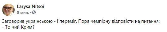 Мовная активистка Лариса Ницой заявила, что Усик победил, потому что "заговорил по-украински". И теперь ему следует "правильно" ответить на вопрос "чей Крым?".