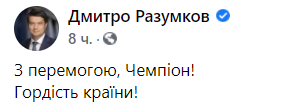 Первым украинского боксера поздравил мэр Киева Виталий Кличко, который присутствовал на поединке и сразу после него обнялся с Усиком. А потом опубликовал и пост в соцсетях.