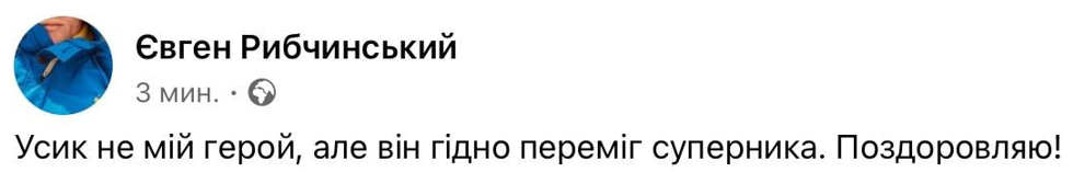Экс-нардеп Евгений Рыбчинский прошел интересные метаморфозы. Накануне боя он написал пост, где обвинил Усика за воцерковление "в московском паханате". И заявил, что теперь он "ни Богу свечка, ни черту кочерга".