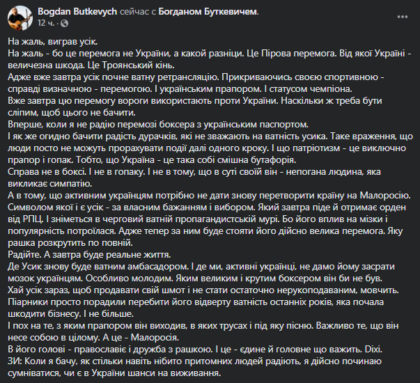 Журналист Богдан Буткевич констатировал, что "к сожалению победил Усик". И отметил, что это "Пиррова победа" и "Троянский конь". Буткевич упрекнул соотечественников, которые не видят, что Усик "ватник", и заяил, что уже "сомневается, что у Украины есть шансы на выживание".