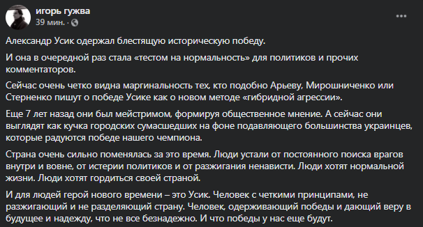 Главный редактор сайта "Страна.ua" Игорь Гужва обратил внимание, что победа Усика в очередной раз стала "тестом на нормальность" для политиков и прочих комментаторов.