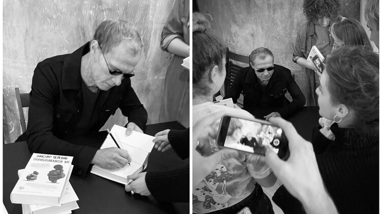 Читатели радо позировали на фоне "двойника" Пелевина, делали фотографии того, как он подписывает экземпляры восемнадцатого романа писателя под названием Transhumanism Inc.