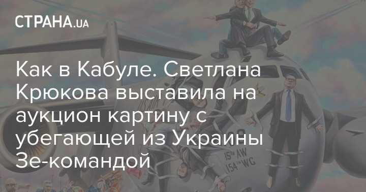Заместитель главного редактора "Страны" Светлана Крюкова выставила на аукцион очередную картину, на которой вполне узнаваемые украинские политики бегут из страны, "оседлав" всеми возможными способами американский военный самолет. Таким образом автор проводит аналогию с недавними событиями в оставленном американцами Афганистане, когда многие пытались сбежать из страны, ухватившись за военно-транспортный самолет США.