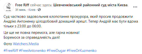 Фигуранту дела об убийстве журналиста Павла Шеремета музыканту и ветерану АТО Андрею Антоненко смягчили меру пресечения. Шевченковский районный суд Киева частично удовлетворил ходатайство прокурора, который просил продлить Антоненко круглосуточный домашний арест. Теперь подсудимый должен находиться дома только с 23:00 до 06:00. Об этом сообщается на странице Free Riff в соцсети.