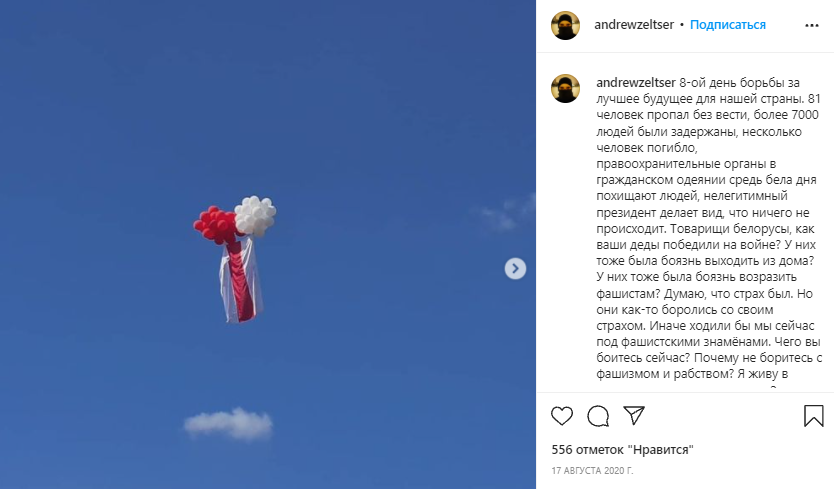 "8-ой день борьбы за лучшее будущее для нашей страны. 81 человек пропал без вести, более 7000 людей были задержаны, несколько человек погибло, правоохранительные органы в гражданском одеянии средь бела дня похищают людей, нелегитимный президент делает вид, что ничего не происходит. Товарищи белорусы, как ваши деды победили на войне? У них тоже была боязнь выходить из дома? ... Я живу в городе с населением почти в 2 млн человек, но на улицах в протестных движениях вижу не более 30 000. О стране беспокоится только 1% населения? Серьезно? И это в основном уличные протесты, которые вообще не возымеют никакого эффекта, если к ним не подключатся основные драйверы бюджетного сектора экономики...", - писал Андрей Зельцер.