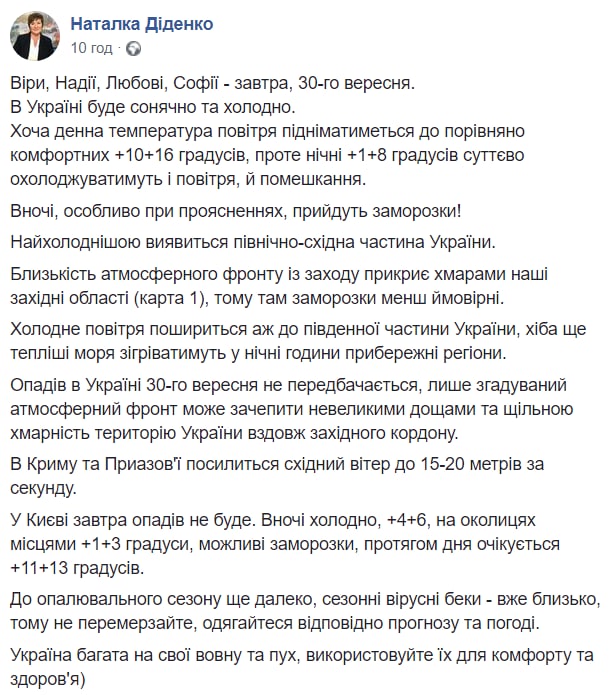 Синоптик Наталья Диденко поделилась прогнозом на 29 сентября. Источник: Facebook/Наталья Диденко