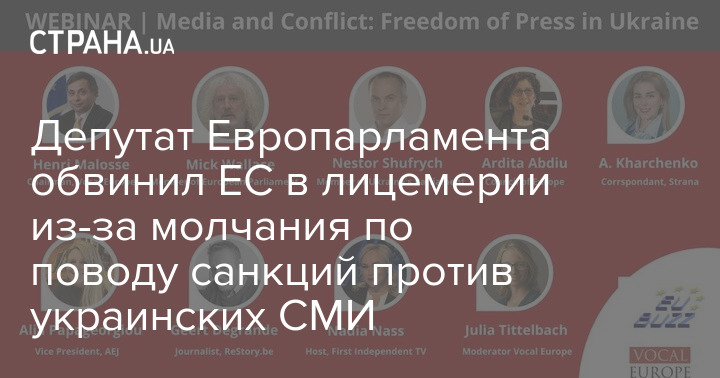Европейские эксперты высказались о санкциях СНБО в отношении украинских СМИ, которые были заблокированы без каких-либо причин и судебного разбирательства, на вебинаре по свободе слова в Украине, организованном брюссельским аналитическим центром Vocal Europe.