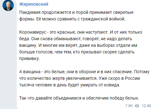 "Коронавирус - это красные, они наступают, и от них только беда. Они снова обманывают, говорят, не надо делать вакцину. И многие им верят, даже на выборах отдали им больше голосов, чем тем, кто призывал скорее сделать прививку. А вакцина - это белые, они в обороне и в них спасение. Потому что количество жертв увеличивается. Уже скоро в России тысяча человек в день будет умирать от ковида. Так что давайте объединимся и обеспечим победу белых", - написал политик в своем Telegram-канале.
