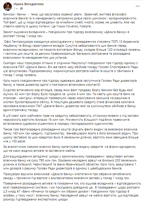 "Сегодня наши прокуроры совместно со следователями Нацполиции уведомили о подозрении одного из владельцев ПАО "Дельта банк". Он же в свое время занимал должность председателя наблюдательного совета этого финучреждения. Подозреваемому инкриминируется растрата имущества и средств с убытком более чем 1 млрд грн", - написала Венедиктова в соцсети.