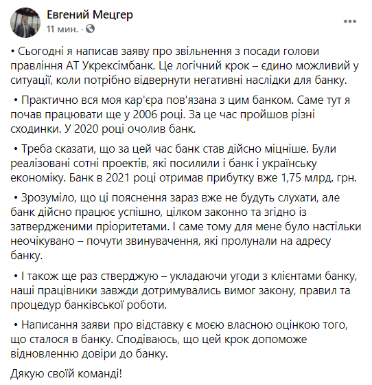 "Сегодня я написал заявление об увольнении с должности председателя правления Укрэксимбанка. Это логичный шаг - единственно возможный в ситуации, когда нужно отвлечь негативные последствия для банка", - написал Мецгер на странице в Facebook.