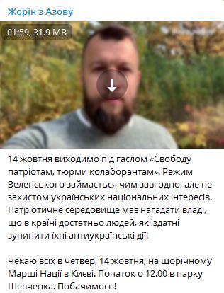 "Власть выбрала путь борьбы с патриотами и защитниками, вместо того, чтобы бороться с предателями и коллаборантами. Поэтому марш 14 октября - это еще и предупреждение для сегодняшней власти", - завил он анонсируя шествие.