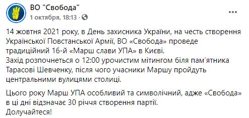 На 16-й "Марш славы УПА" пойдет и ВО Свобода. Там анонсировали, что он начнется в полдень с митинга у памятника Тарасу Шевченко, после чего участники пройдут по центральным улицам столицы.