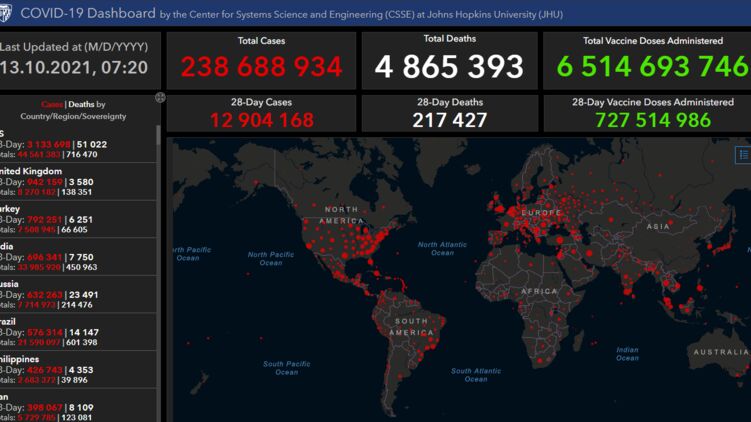 Университет Джона Хопкинса также привел новую и печальную статистику на утро 13 октября. С начала пандемии на планете уже 238 688 934 человек заразились СOVID-19. Умерли с начала пандемии - 4 865 393 человека.