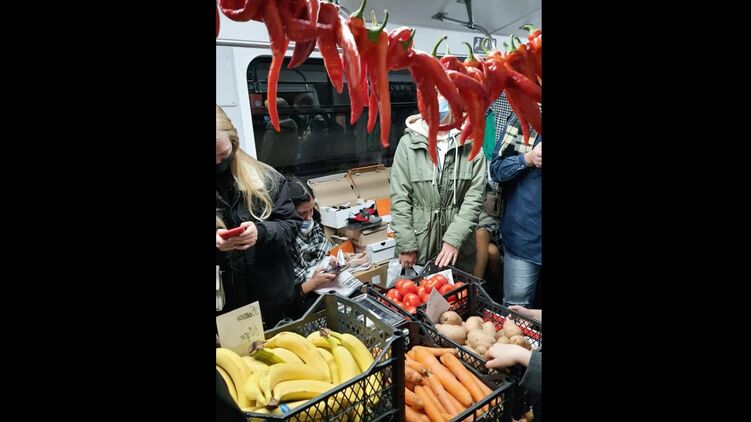 Организаторы акции затащили в вагон ящики с фруктами и овощами. Фото: facebook.com/natalka.makogon