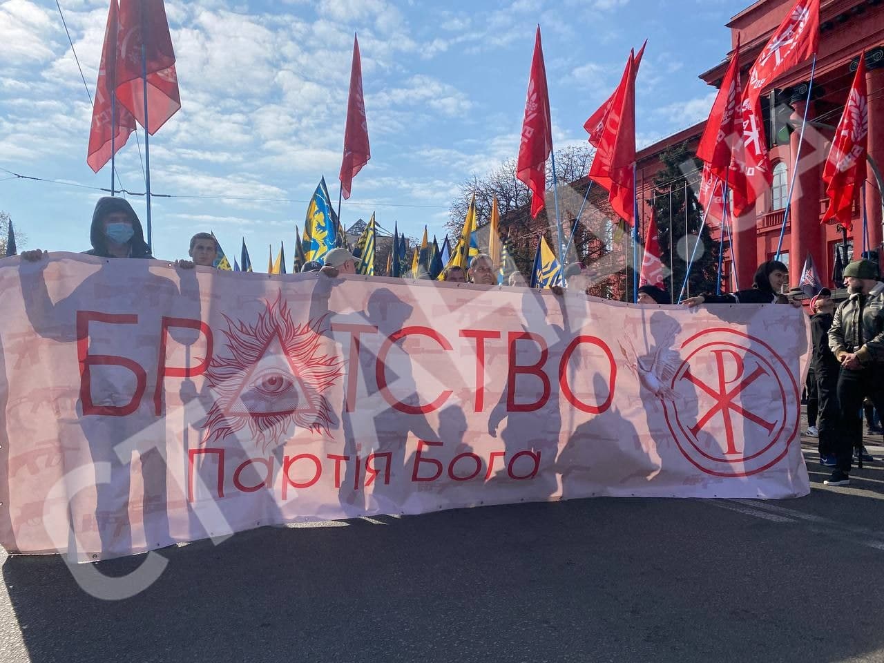 Идет активная торговля значками с соответствующей символикой. А "Братство" Корчинского держит плакат о том, что они "партия бога".