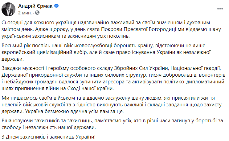 10:48 С праздником поздравил глава Офиса президента Андрей Ермак. Он заявил, что ВСУ на Донбассе отстаивали "европейский цивилизационный выбор".