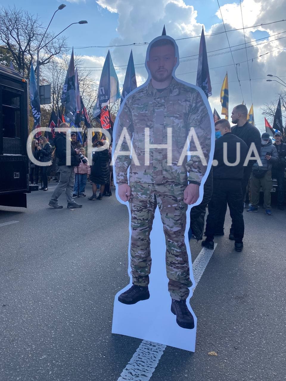 13:48 Митинг по удаленке. Участники марша принесли картонную фигуру одного из членов Нацкорпуса, который не может принять участие в шествии, потому что находится в СИЗО после акции протеста Нацкорпуса под зданием ОП.