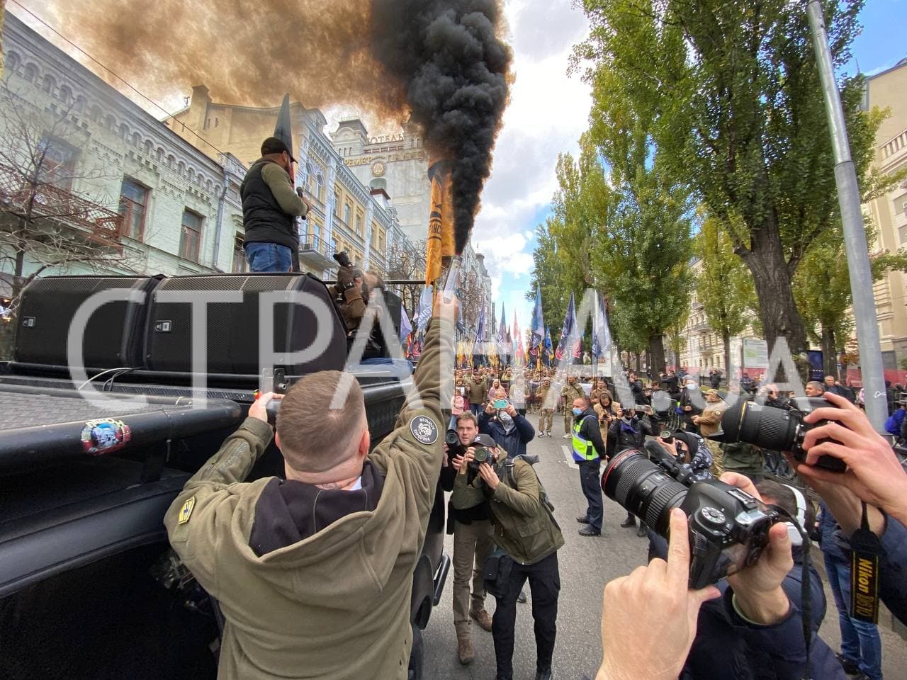 15:00 Участники марша националистов зажгли файеры, весь центр Киева в дыму.