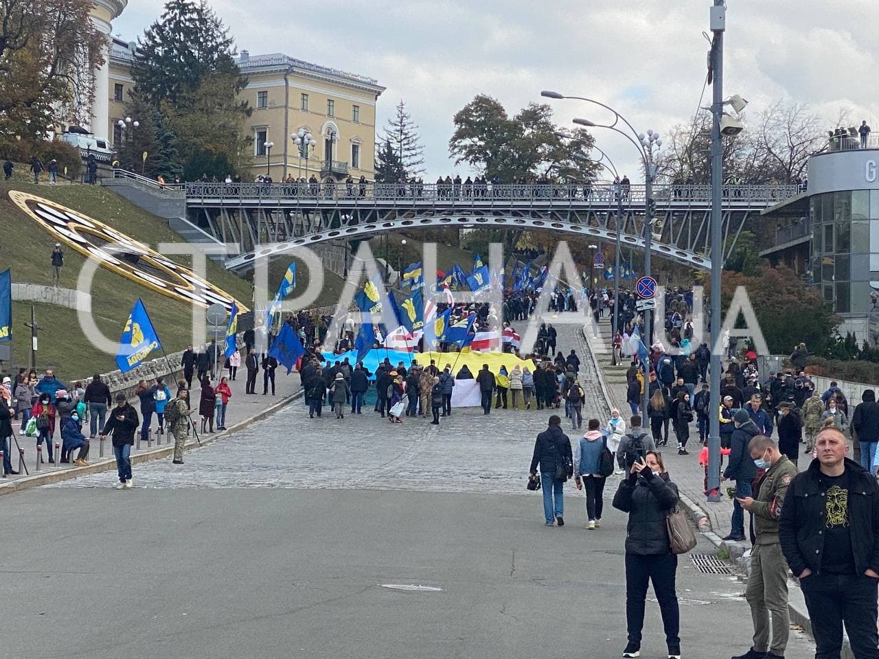 14:52 "Марш нации" подходит к Майдану Независимости. Скандируют "Свободу патриотам, тюрьмы коллаборантам".