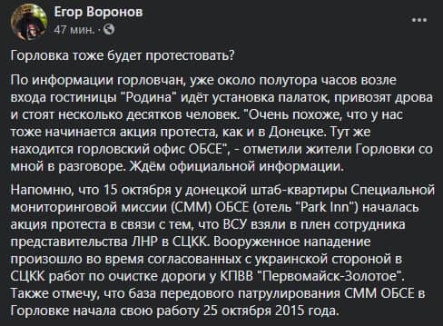 "По информации горловчан, уже около полутора часов возле входа гостиницы "Родина" идёт установка палаток, привозят дрова и стоят несколько десятков человек. "Очень похоже, что у нас тоже начинается акция протеста, как и в Донецке. Тут же находится горловский офис ОБСЕ", - отметили жители Горловки со мной в разговоре. Ждём официальной информации", - написал он