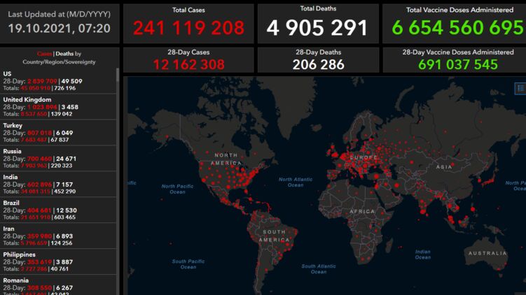 По данным на утро 19 октября число зараженных в мире перевалило за 241 миллион, фото arcgis.com