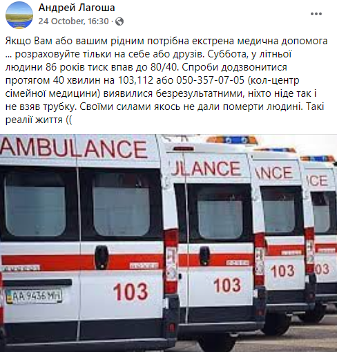 "Если Вам или вашим родным нужна экстренная медицинская помощь… рассчитывайте только на себя или друзей. Суббота, у пожилого человека 86 лет давление упало до 80/40. Попытки дозвониться в течение 40 минут на 103,112 или 050-357-07-05 (колл-центр семейной медицины) оказались безрезультатными, никто нигде так и не взял трубку. Своими силами как-то не дали умереть человеку. Таковы реалии жизни", - написал Андрей Лагоша.