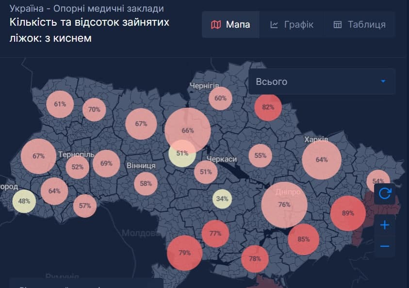 По данным СНБО, минимум шесть регионов находятся в антилидерах по занятым койко-местам с кислородом по состоянию на 25 октября.