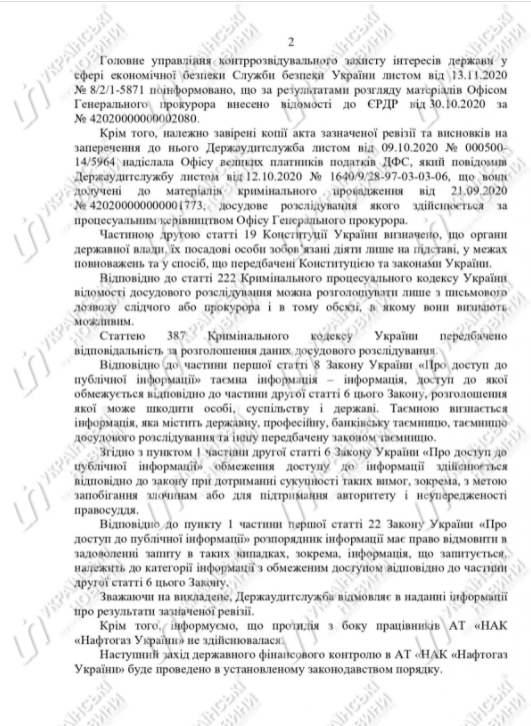 В ответе не сообщаются подробности досудебного расследования, так как по данным Госаудитслужбы они относятся к тайне досубедного расследования и не могут быть разглашены.