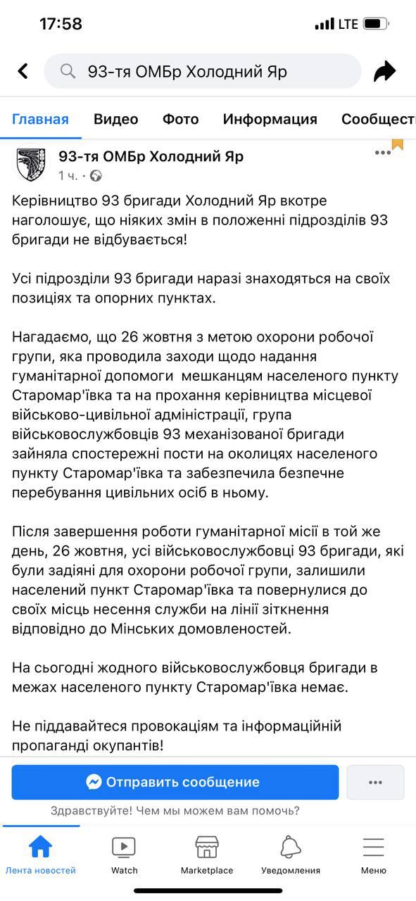 Позже 93-я Бригада "Холодный Яр" официально опровергла заявление Юрия Бутусова о том, что она заняла и удерживает посёлок Старомарьевка в нейтральной зоне на линии фронта на Донбассе.
