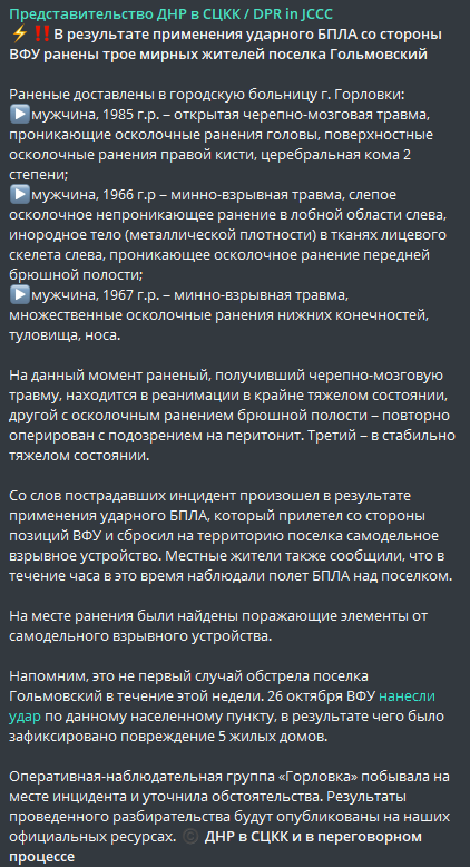 В свою очередь, в "СЦКК ДНР" обвинили ВСУ в применении ударного БПЛА, в результате чего трое ранены мирных жителей поселка Гольмовский (входит в состав Горловки)