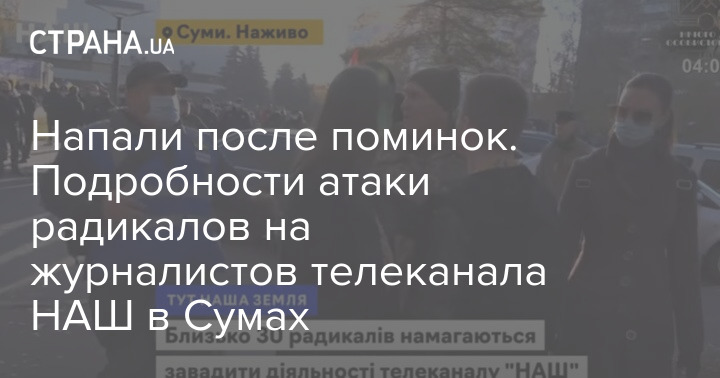 В субботу, 30 октября, во время съёмок спецпроекта "Здесь наша земля" в Сумах на журналистов телеканала "НАШ" напали несколько десятков радикалов. Активисты применяли физическую силу к журналистам и операторам, требуя закончить прямой эфир.