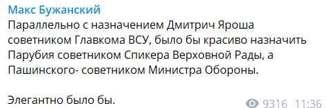 Нардеп Макс Бужанский по этому поводу иронизирует: "Избиратели Слуги Народа решительно приветствуют назначение Дмитрия Яроша советником Главкома ВСУ в комментариях к его посту.