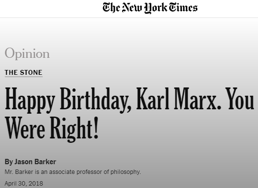 Чего стоит заголовок в "Нью-Йорк таймс" на недавнее двухсотлетие отца мирового пролетариата: "С днем рождения, Карл Маркс! Вы были правы!"