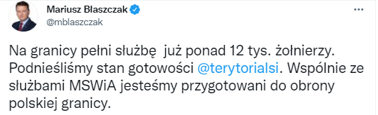 "На границе несут службу уже более 12 тыс. солдат. Мы повысили уровень готовности войск территориальной обороны. Вместе со службами МВД мы готовы к обороне польской границы", - написал в Twitter министр национальной обороны Польши Мариуш Блащак.