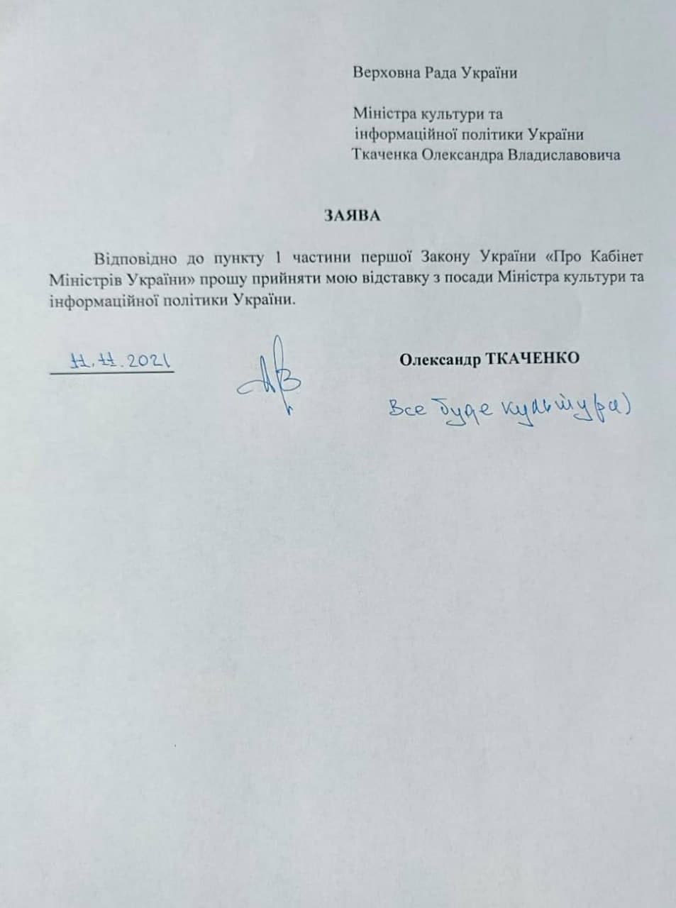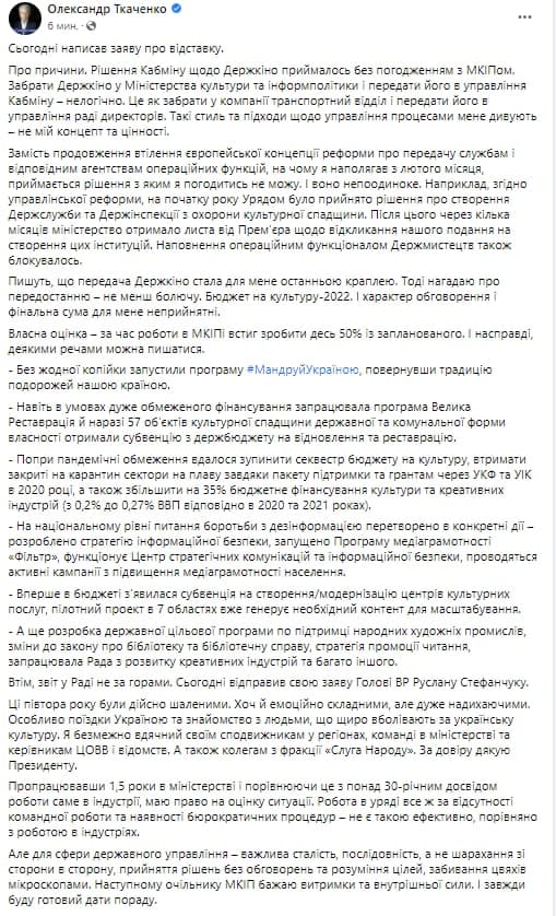 Министр культуры Александр Ткаченко подал заявление об отставке. Об этом ос сообщил на своей странице в соцсети. Там же он написал, что причиной его желания покинуть должность стало то, что Кабинет министров забрал Госкино из подчинения Минкульта