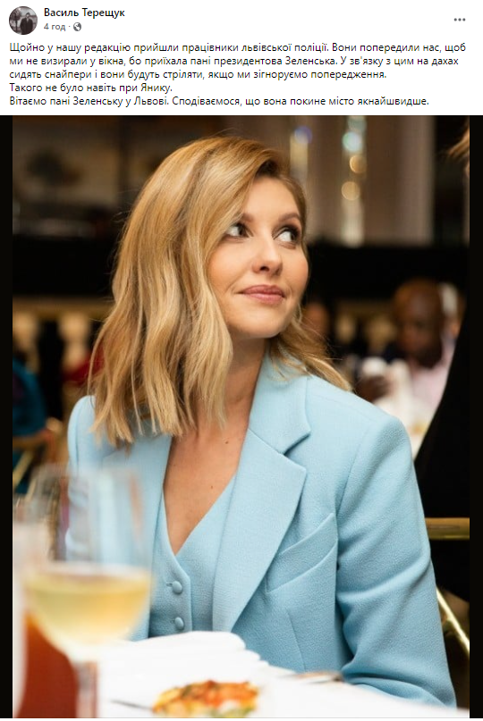 "Только что в нашу редакцию пришли работники львовской полиции. Они предупредили нас, чтобы мы не выглядывали в окна, потому что приехала госпожа Зеленская. В связи с этим на крышах сидят снайперы и они будут стрелять, если мы проигнорируем предупреждение, - процитировал Василий Терещук полицейских.