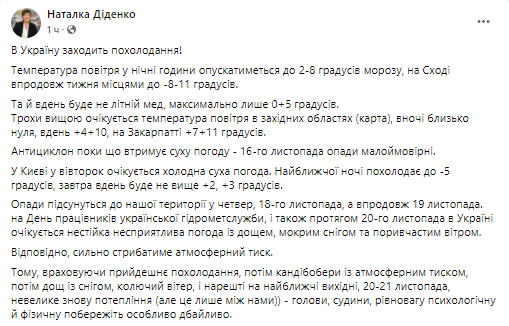 Об этом сообщает синоптик Наталья Диденко на своей странице в Facebook.